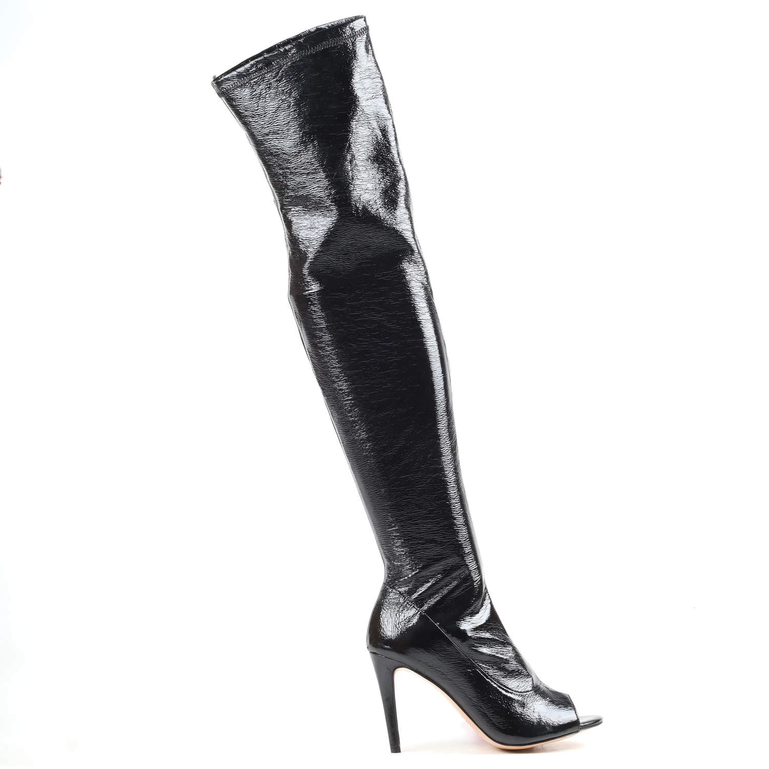 Achieve high-shine glamour with the Noelle Peep-Toe Boot. The glossy black patent stretch leather offers a custom fit, while the open toe cut-out adds a unique, sophisticated edge, perfect for transitional weather.